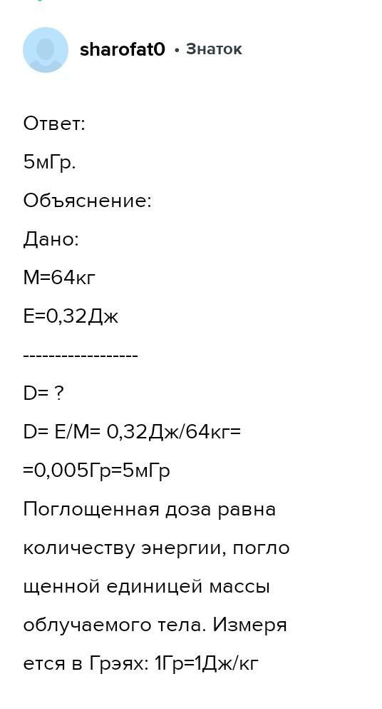 Определите поглощенную дозу излучения, если тело человека массой 64 кг в течение года поглотило радиоактивное излучение с энергией 0,32 Дж.
