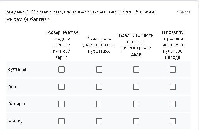 султаны -3 , бии -2 , батыры - 1, жырау -4 . Попробуй так Здесь уже уверен!