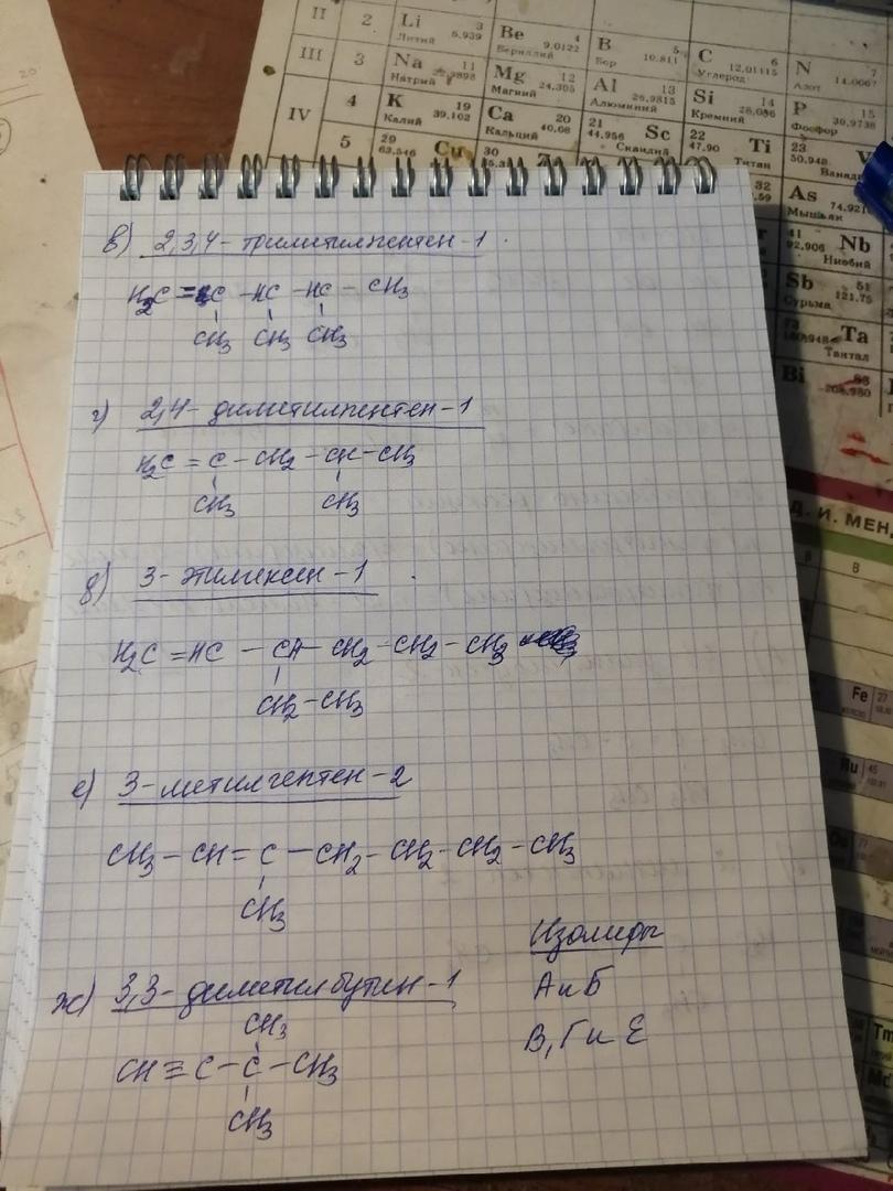 назовите формулу веществ пронумеруйте углеводородной цепи определите формулы изомеров и гомологов А 2 3 диметилбутен b2 метилпентен 2 b 2 3 4 триметилпентен 1 г 2 4 диметилпентен 1 д 3 этилгексан 1 e3 метилгептен 2 ж 3 3 диметилбутин 1