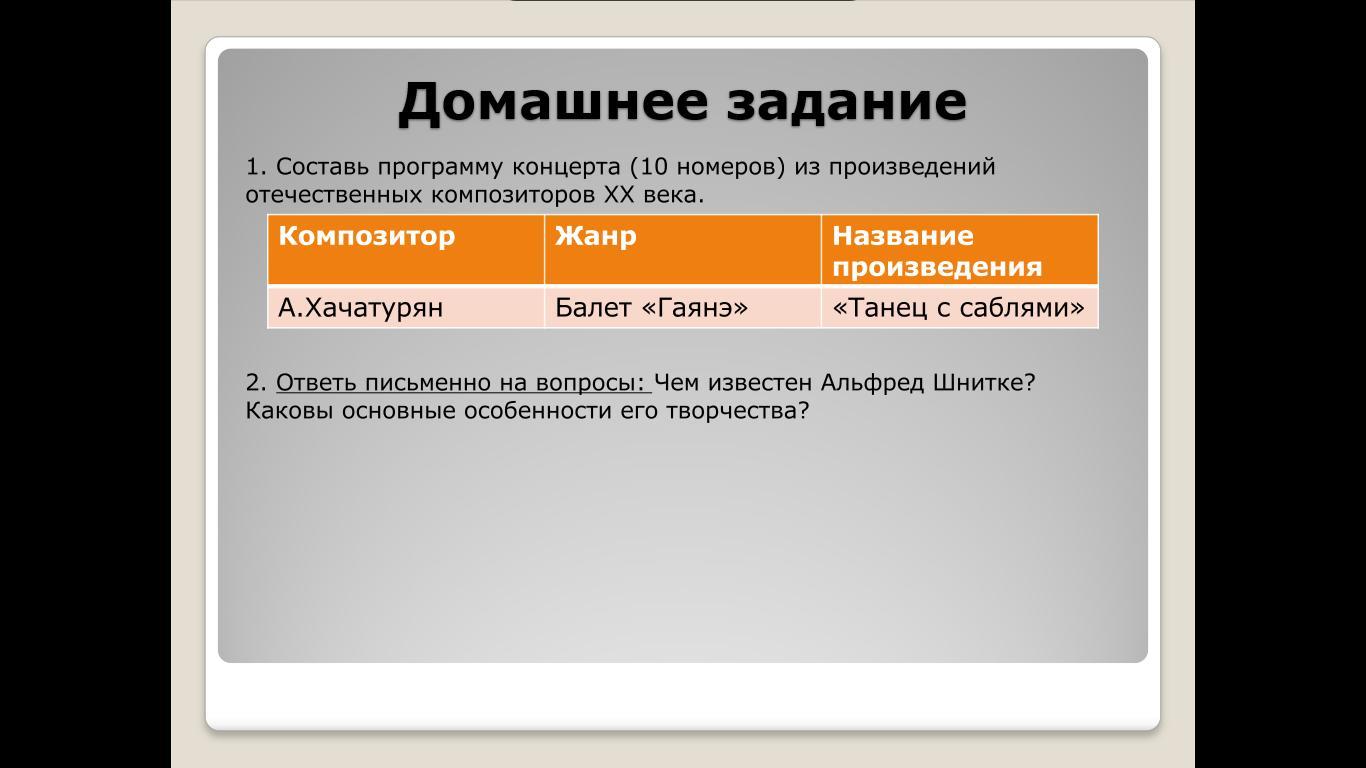 1.Составь программу концерта (10 номеров) из произведений отечественных композиторов ХХ века.