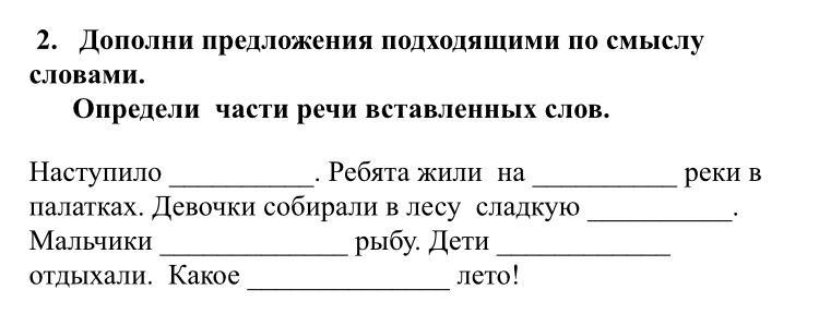 Наступило лето. Ребята жили на горах реки в палатках. Девочки собирали в лесу сладкую малину. Мальчики ловили рыбу. Дети отлично отдыхали. Какое классное лето!