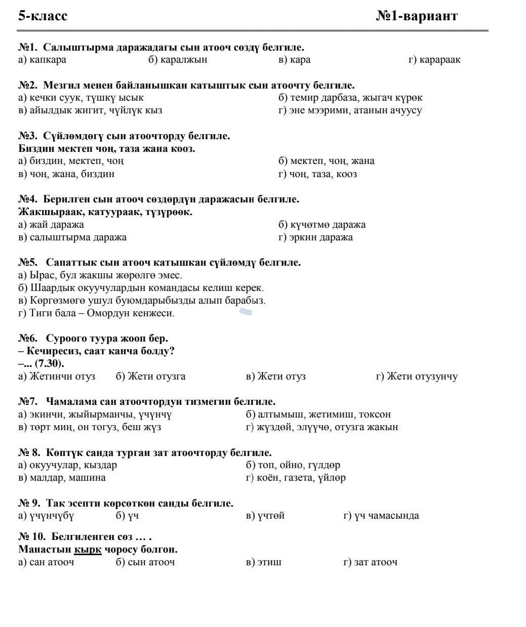 Ответ:1)г карараак, 2)акечки суук,тушку ысык,3)г Чонтаза кооз,4)в салыштырма даража,6)в жети отуз 7)г жуздой,элуучо,отузга жакын,8)а окуучулар,кыздар,9)б уч 10)а сан атооч