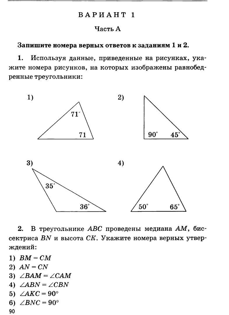 в первом задании если один угол равен 90 градусов,а второй 45,то третий=180-90-45=45