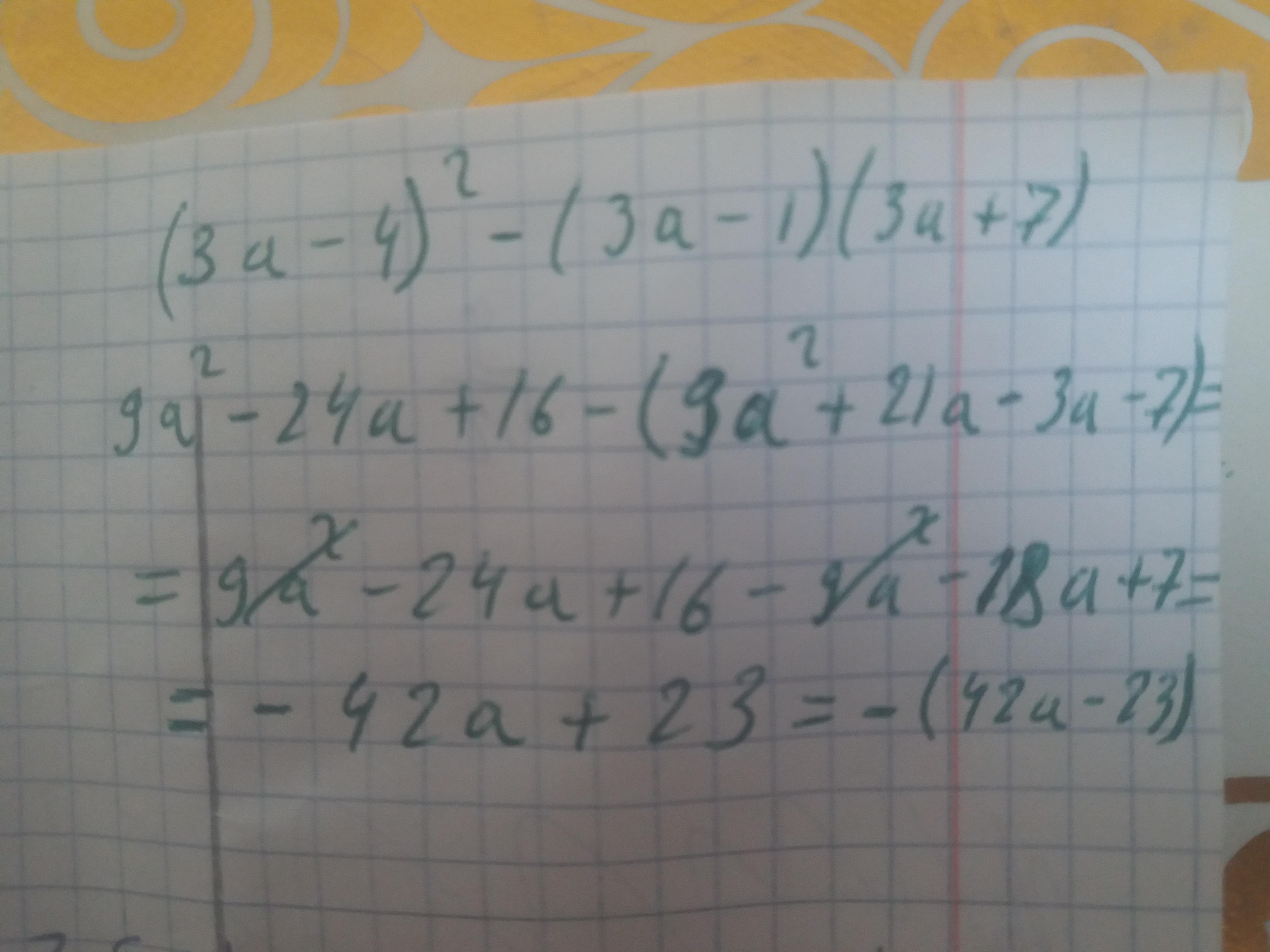 9а^2-24а+16-(9а^2+21а-3а-7)