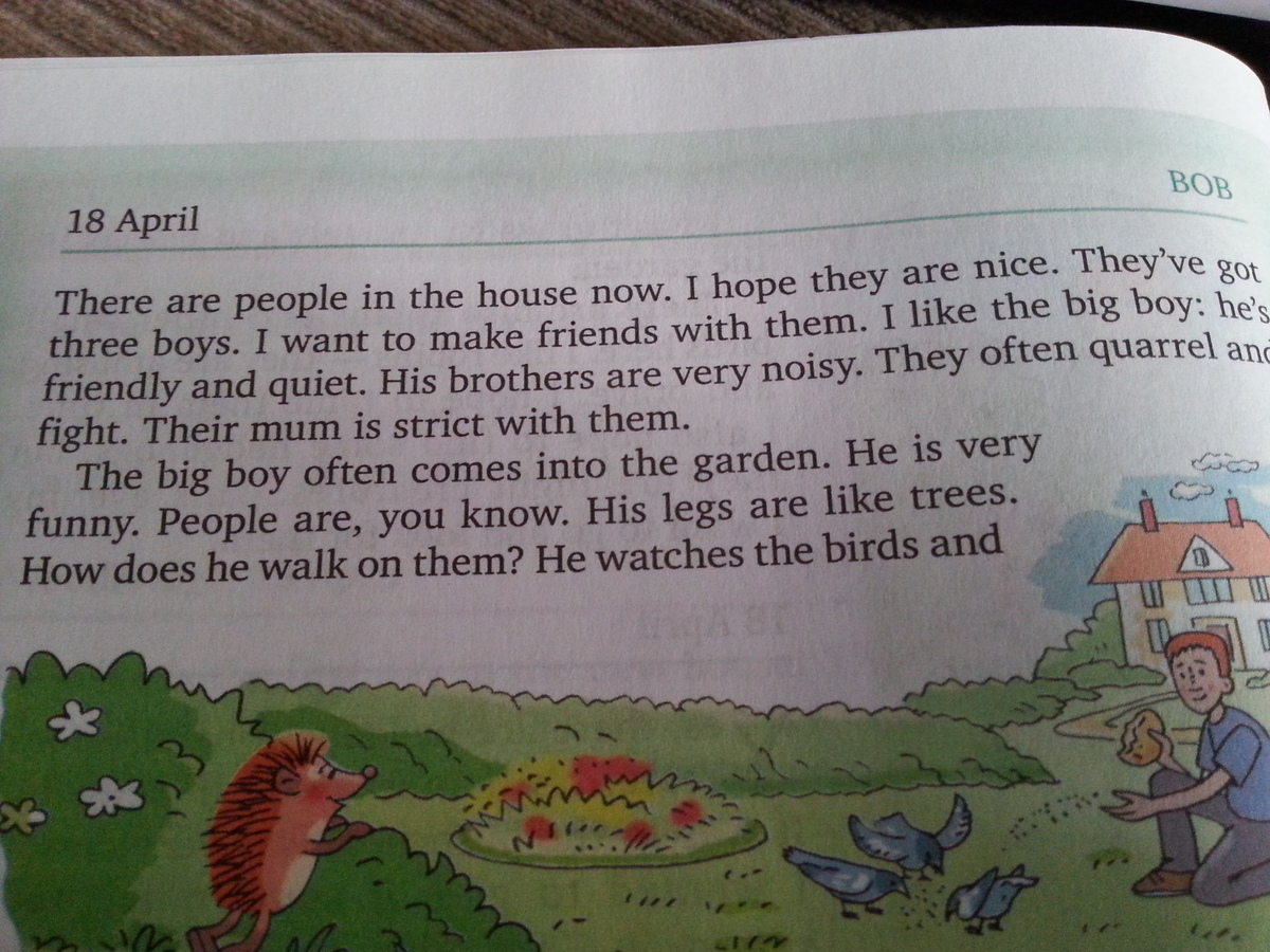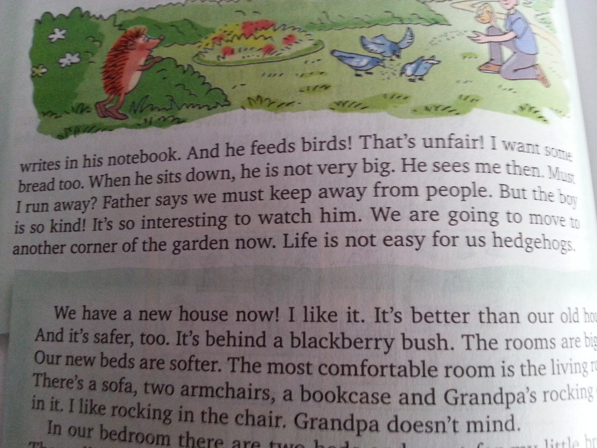 1) В доме сейчас люди. 2) Я надеюсь, что они хорошие. 3) У них есть три мальчика. 4) Я хочу подружиться с ними. 5) Мне нравиться старший мальчик: Он дружелюбный и спокойный. 6) Его браться очень шумные. 7) Они часто ссорятся и дерутся. 8) Их мать строга с ними. 9) Старший мальчик часто ходит в сад. 10) Он очень смешной. 11) Люди, вы знаете. 12) Его ноги подобны деревьям. 13) Как он ходит с ними? 14) Он наблюдает за птицами и пишет в своем блокноте. 15) И он кормит птиц! 16) Это не справедливо! Я тоже хочу немного хлеба. 17) Когда он садиться, он не очень большой. 18) Он тогда меня рассматривает. 19) Должна ли я бежать? 20) Отец говорит, что мы должны держаться подальше от людей. 21) Но мальчик так добр! 22) Это так интересно смотреть на него. 23) Мы сейчас собираемся переехать в другую часть сада. 24) Жизнь для нас ежей не так проста.