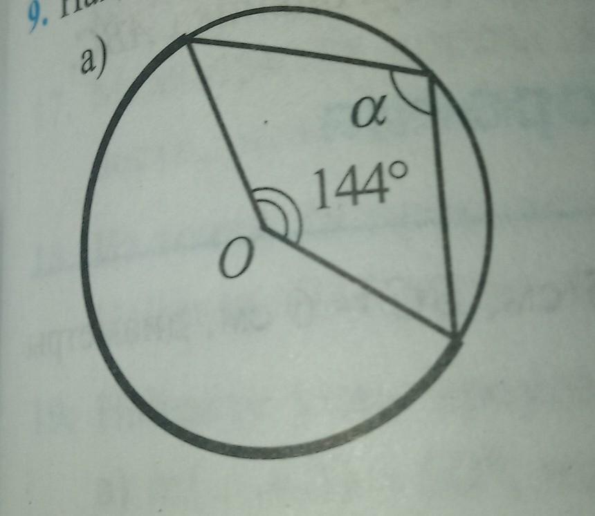 угол альфа является вписанным, следовательно он равен половине дуги, на которую он опирается, то есть большой дуги АВ. соответственно угол альфа равен 216 градусов / 2 = 108 гр.
