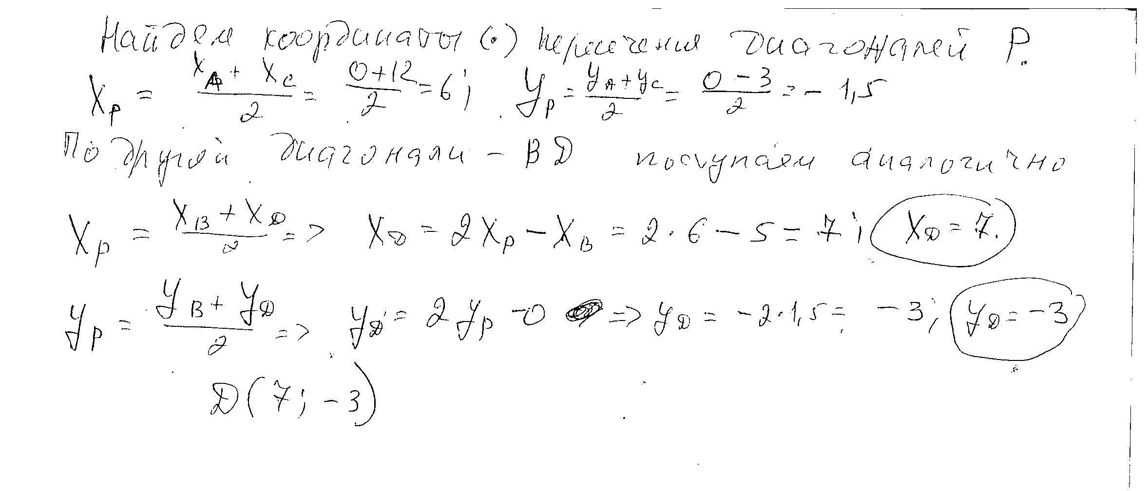 2.Точки А(0;0) B(5;0) C(12;-3) Д(x,y) - вершины параллелограмма АВСД.Найти координаты точки Д. Точка Р - точка пересечение диагонали параллелограмма.