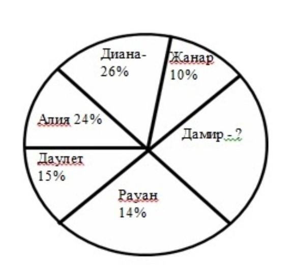 Используя данные круговой диаграммы ответьте на следующие вопросы:а) Сколько процентов голосов набрал Дамир? [2 балла]b) Кто победил на выборах? [1 балл] с) Какие два кандидата набрали в сумме половину всех голосов? [1балл] d) Кто набрал наименьшее число голосов? [1балл] e) Кто занял второе место? [1балл]