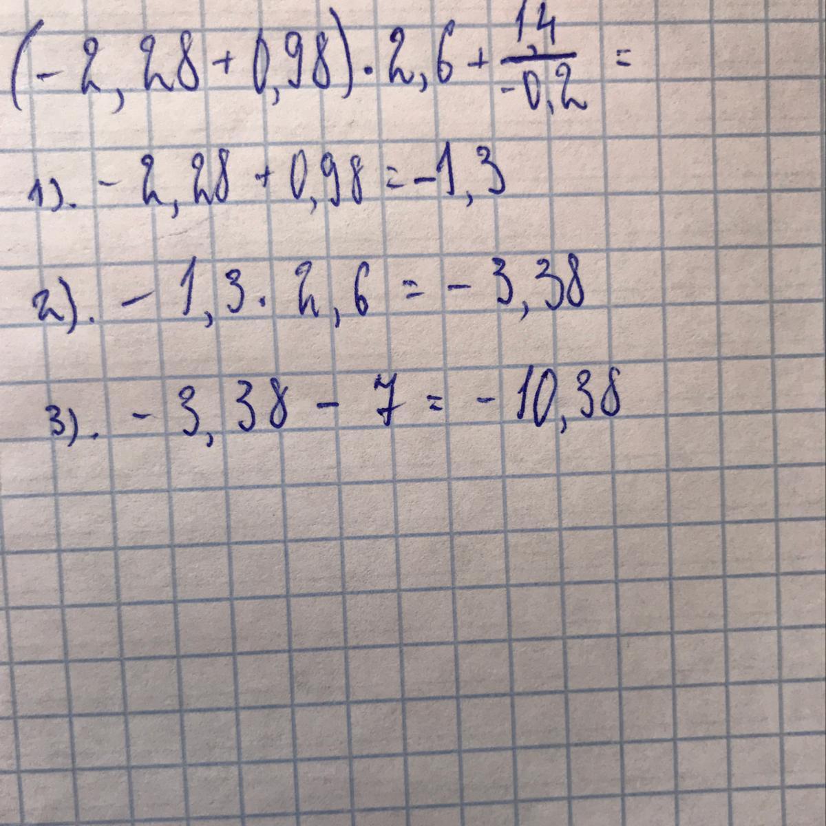 Знайти значення виразу (-2,28+0,98)*2.6+1,4/(-0,2)