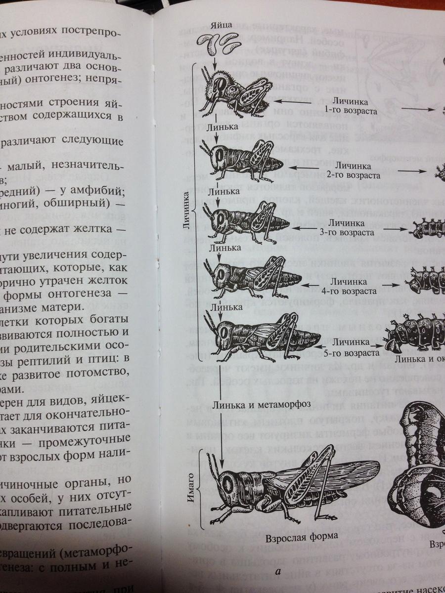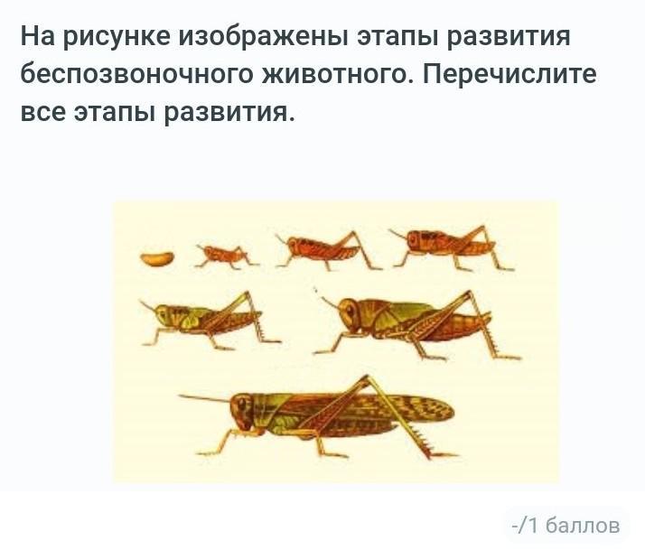 На рисунке изображены этапы развития беспозвоночного животного. Перечислите все этапы развития. (кузнечик)