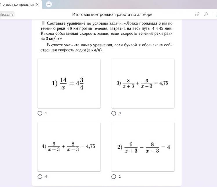 В ответе укажите номер уравнения, если буковой x обозначена собственная скорость лодки(в км/ч)