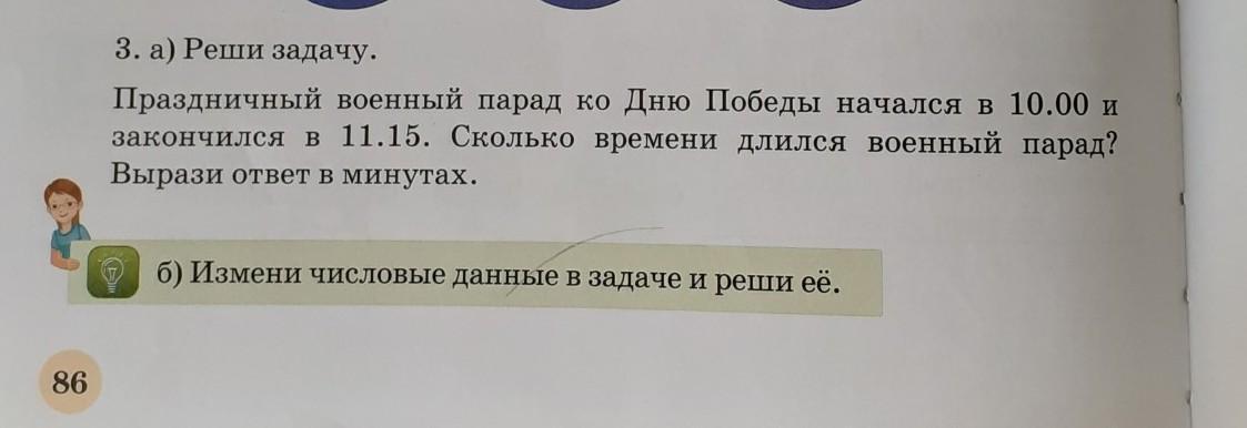 1) 11.15 - 10.00 = 1.15(мин) - длился парад