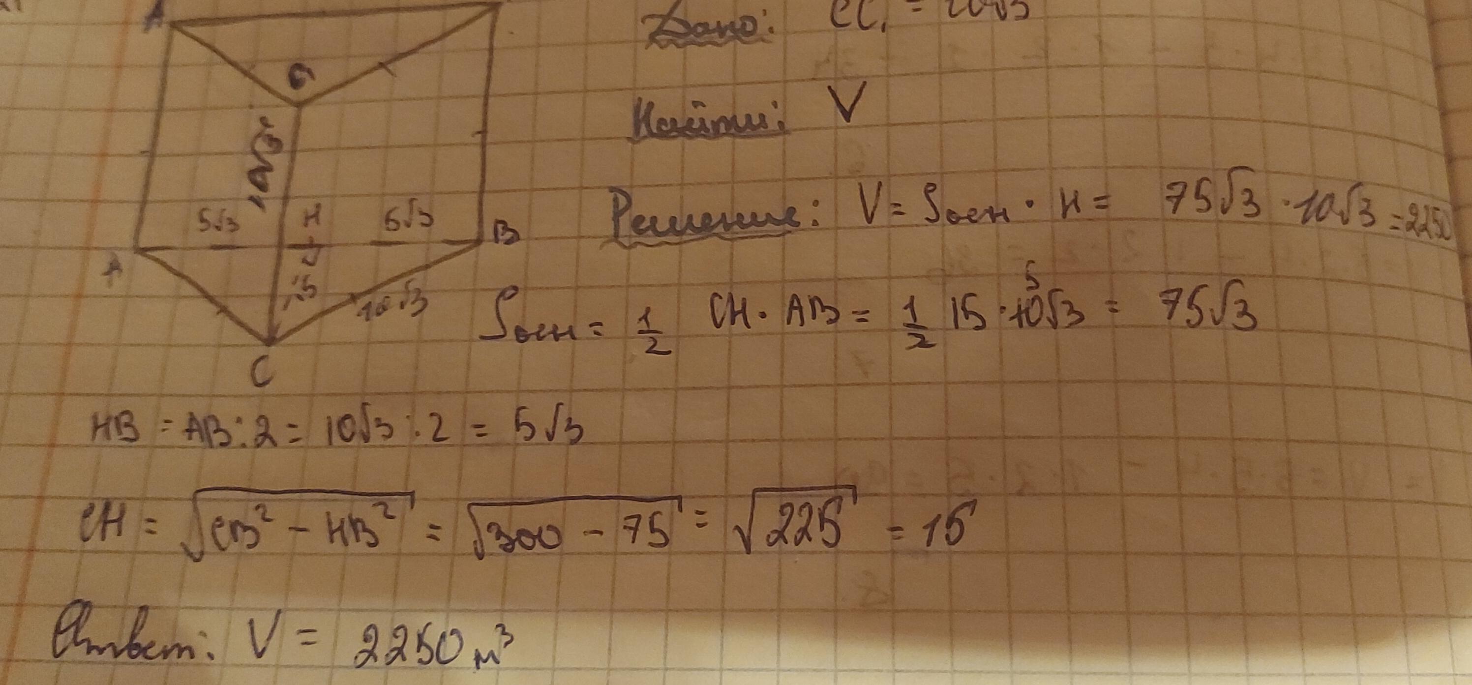 В прямоугольной треугольной призме все боковые грани являются квадратами со стороной 10 корней из 3. Найдите объем призмы. Отдаю все баллы подробное решение пожалуйста