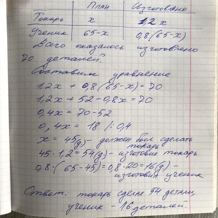 Токарь и его ученик должны были изготовить за смену 65 деталей. Однако токарь перевыполнил план на 20%, а ученик не справился с заданием и сделал на 20% меньше нормы Сколько деталей изготовили токарь и его ученик, если фактически изготовлено 70 деталей?