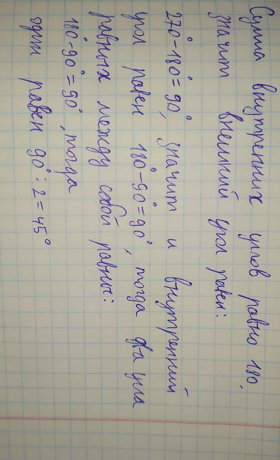 Сумма внутренних углов равнобедренного треугольника вместе с одним из внешних углов равна 270 градусов. Найти все внутренние углы треугольника.