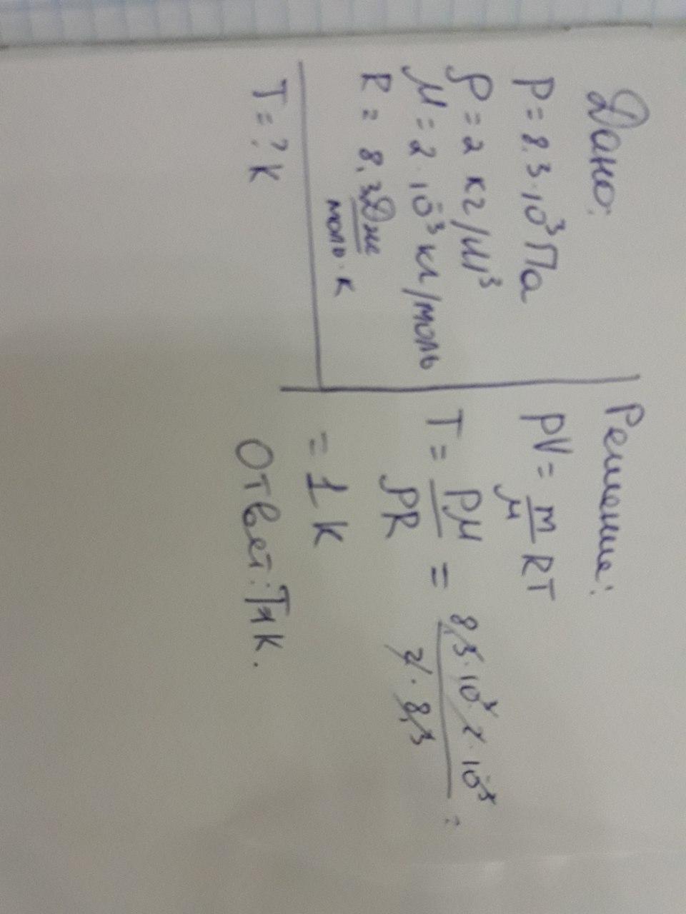 Давление идеального газа равно 8,3 кПа, плотность 2 кг/м³, молярная масса 2 г/моль. Найдите температуру этого газа?