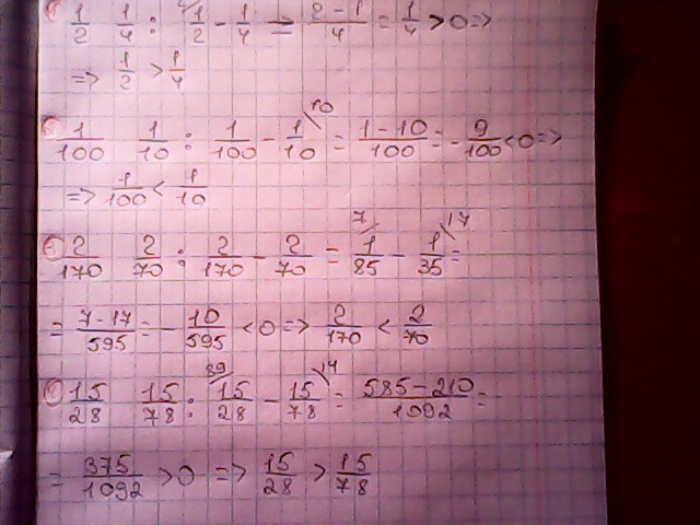 1/2 и 1/4 , 1/100 и 1/10 , 2/170 и 2/70 , 15/28 и 15/78 . сравнить дроби, и привидите их к общему знаменателю