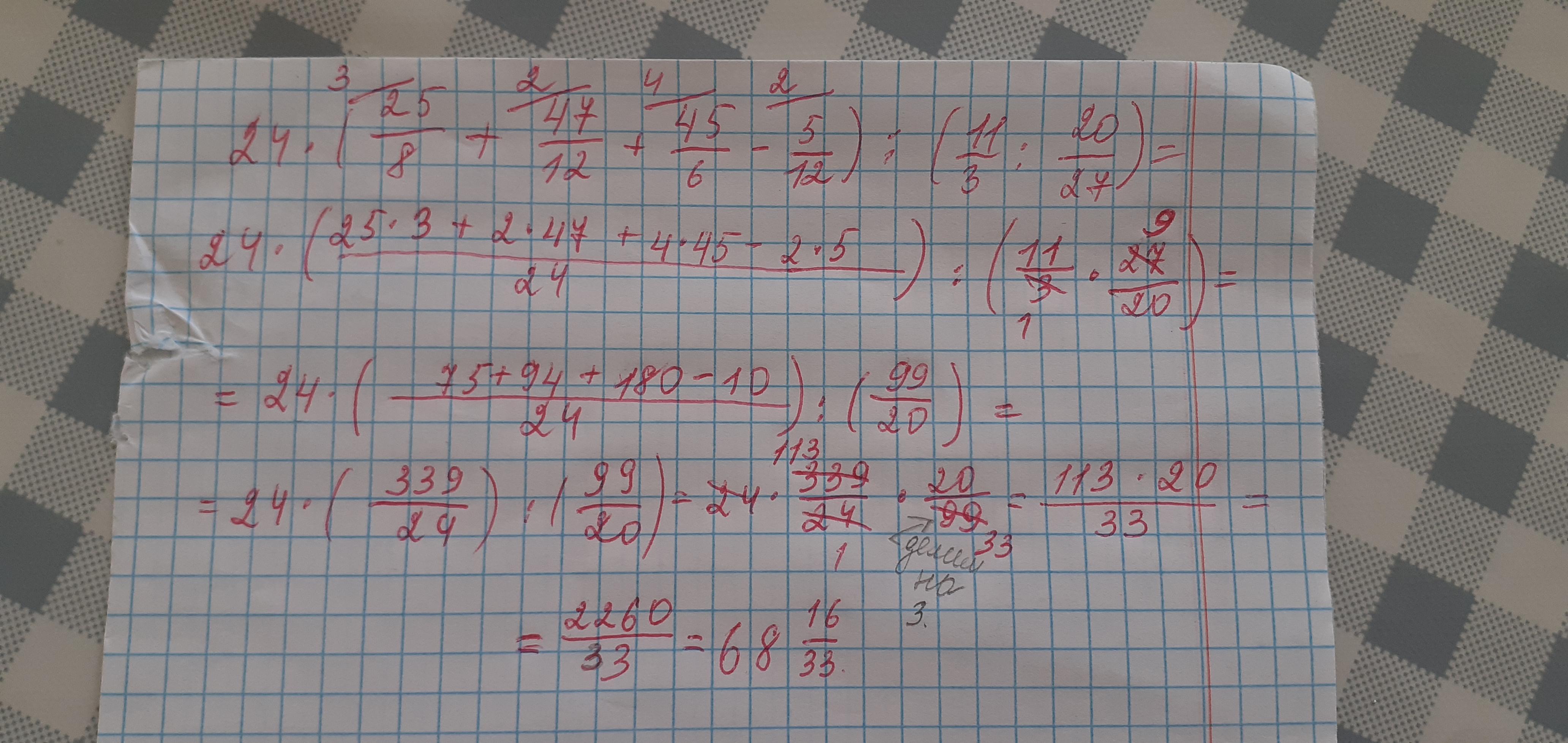 РЕШИТЕ ПРИМЕР ПОЖАЛУЙСТА ПОМОГИТЕ СРОЧНОО!!!, ДАМ МНОГО БОЛЛОВ!!! 24*(2 5/8+4 7/12+ 4 5/6- 5/12)÷( 1 1/3 ÷ 20/27)=???? , помогите по действиям дам...