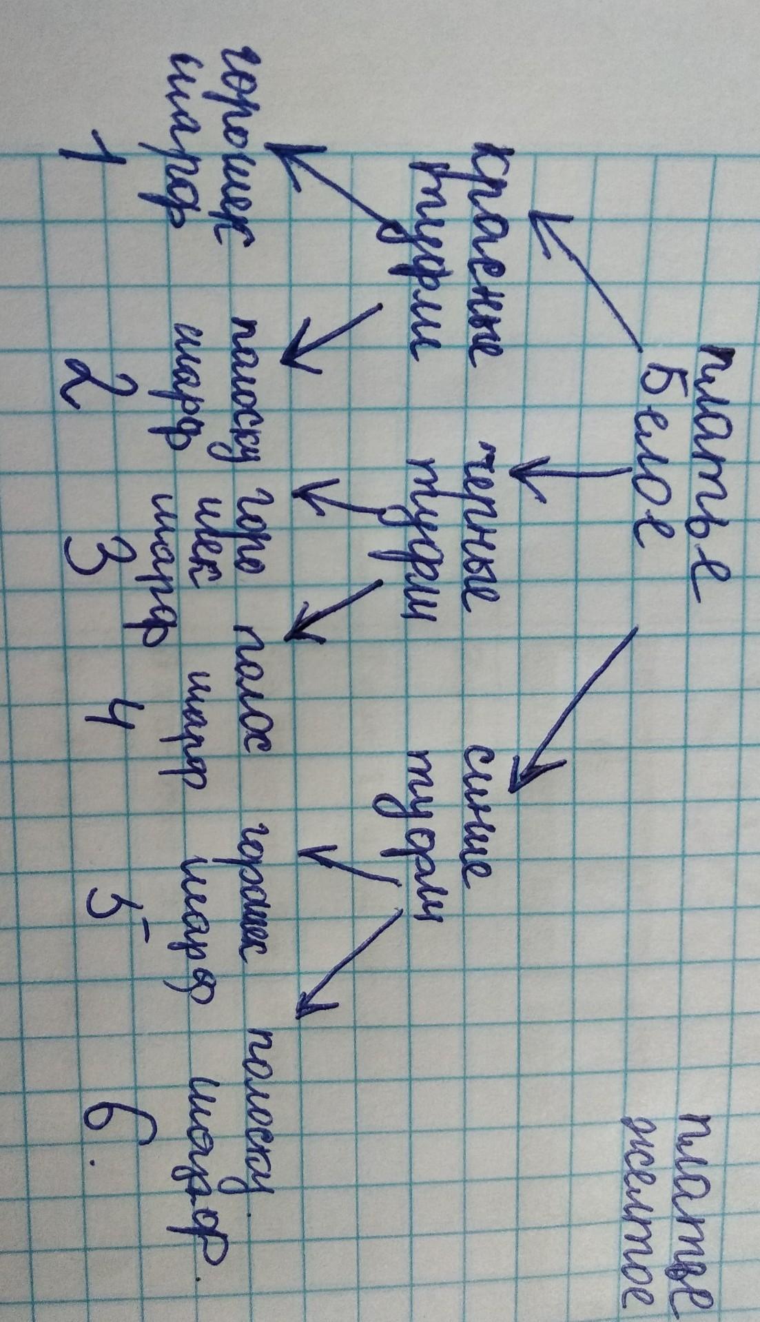 У Мадины есть белое и желтое платья , красные, черные и синие туфли, а