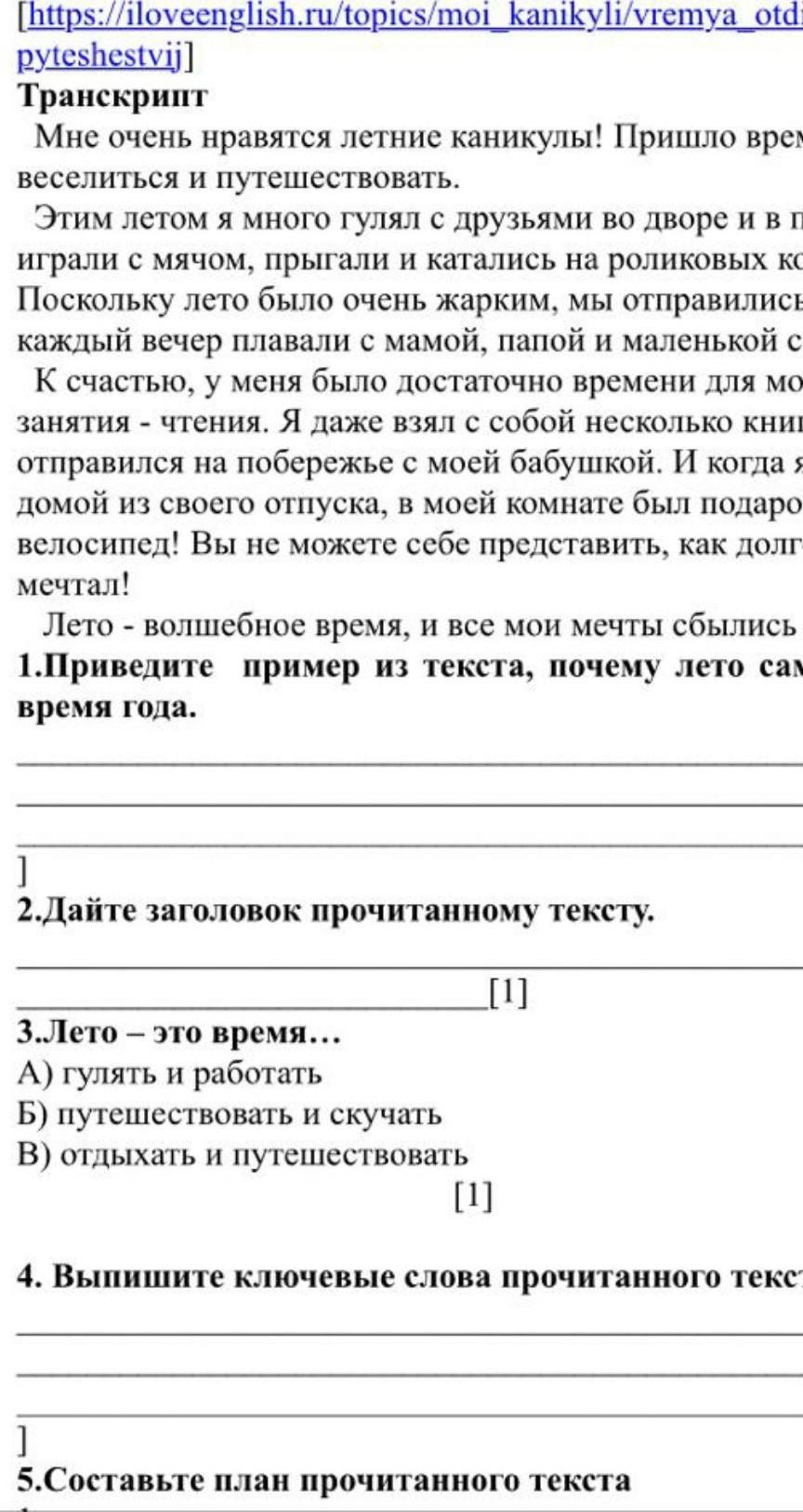 1)-подарили велосипед ,гулял с друзьями ,купание с родителями.2)мои летние каникулы.3)в,4)каникулы,велосипед,отпуск,5)план:1-летние каникулы,2-отпуск ,3- мечта осуществилась,4-лето-волшебное время