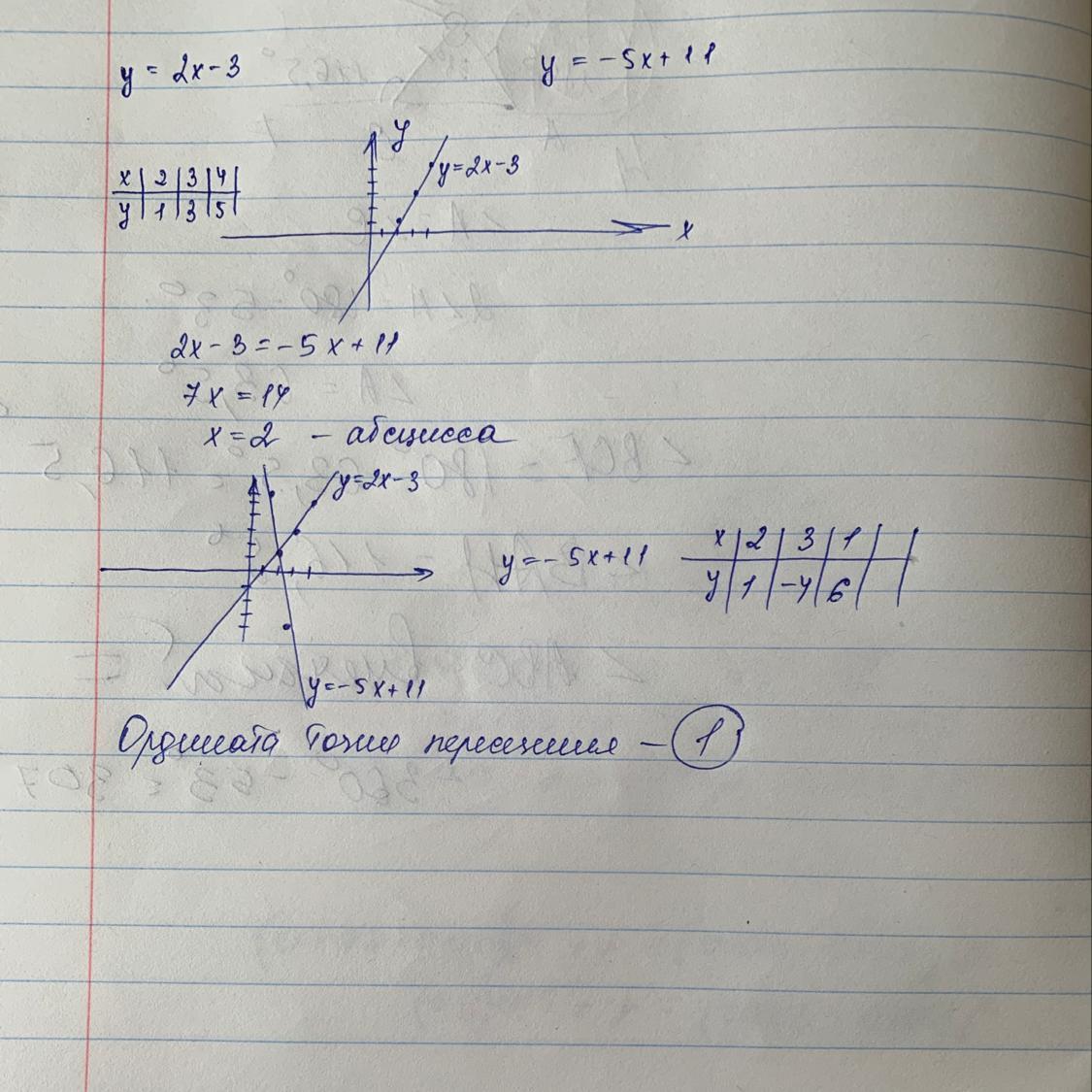 Постройте график функции у = 2х – 3. Найдите ординату точки пересечения этого графика с прямой у = -5х + 11.