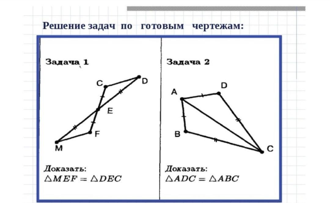 В задаче 2 треугольники равны по 3 сторонам(AD=AB и BC=DC по условию, AC-общая сторона).