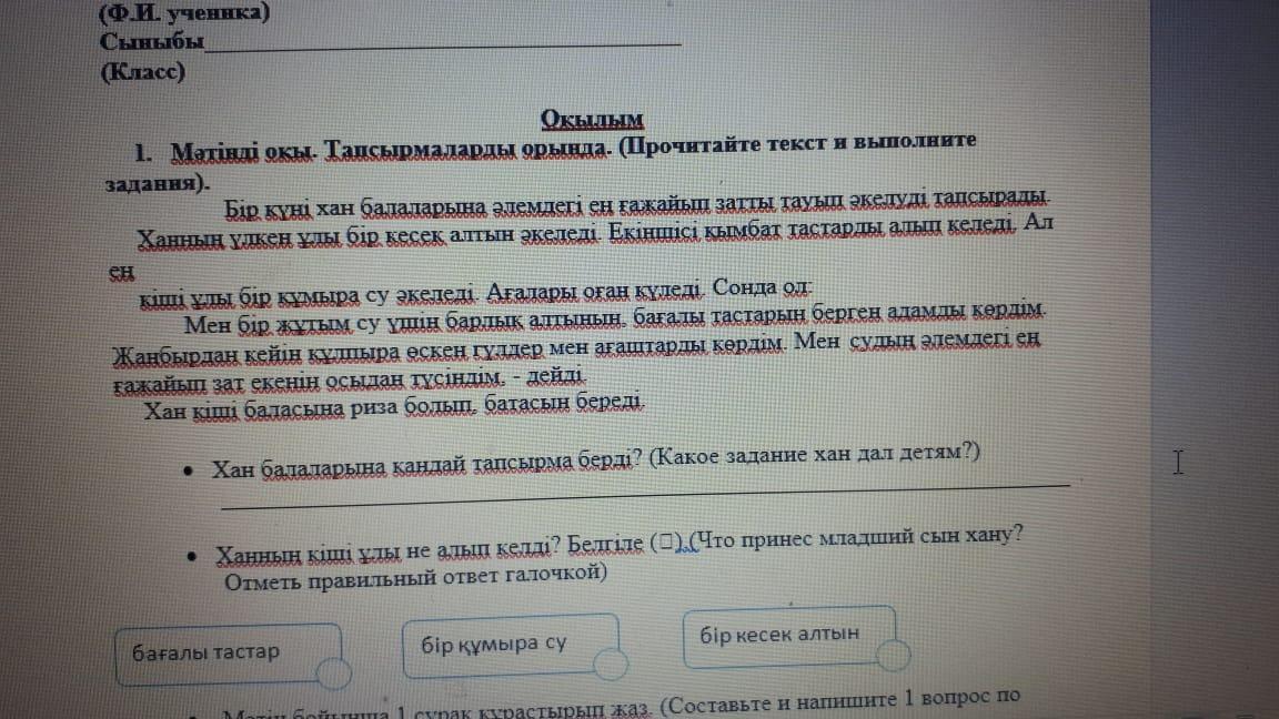 Ответ:•хан балаларына әлемдегі ең ғажайып заттытауып әкелуді тапсырады
