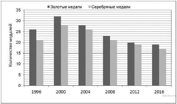 На диаграмме показано, сколько золотых и серебряных медалей завоевали российские спортсмены на Олимпийских играх в разные годы.