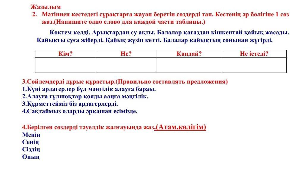 Кім:Көктем келді. Не: Арықтардан су ақты. Қандай: балалар қағаздан кішкентай қайық жасады.