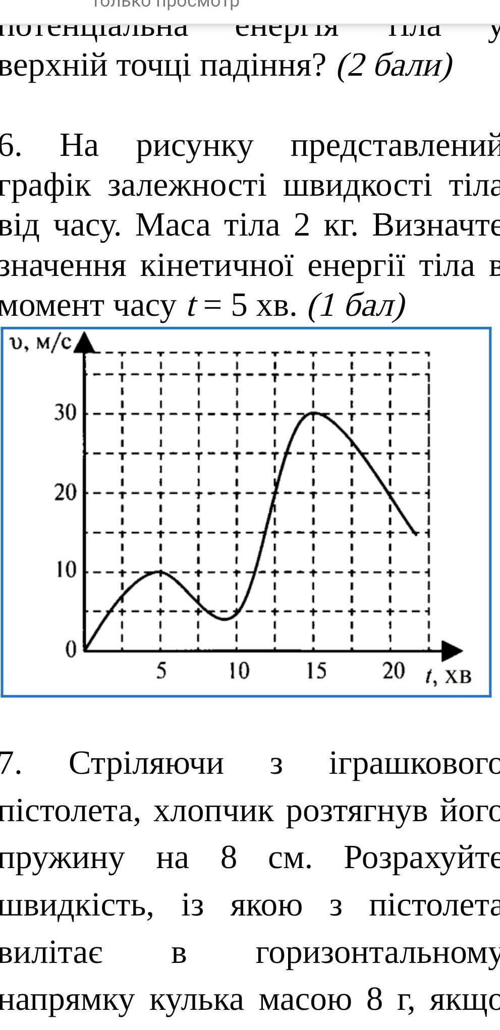 На рисунку представлений графік залежності швидкості тіла від часу. Маса тіла 2 кг. Визначте значення кінетичної енергії тіла в момент часу t = 5 хв.
