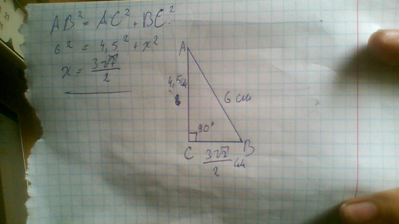 Побудуйте прямокутний трикутник АВС (∠С=90°), за катетом АС=4,5 см та гіпотенузою АВ=6 см!!! Розпишіть! І побудуйте