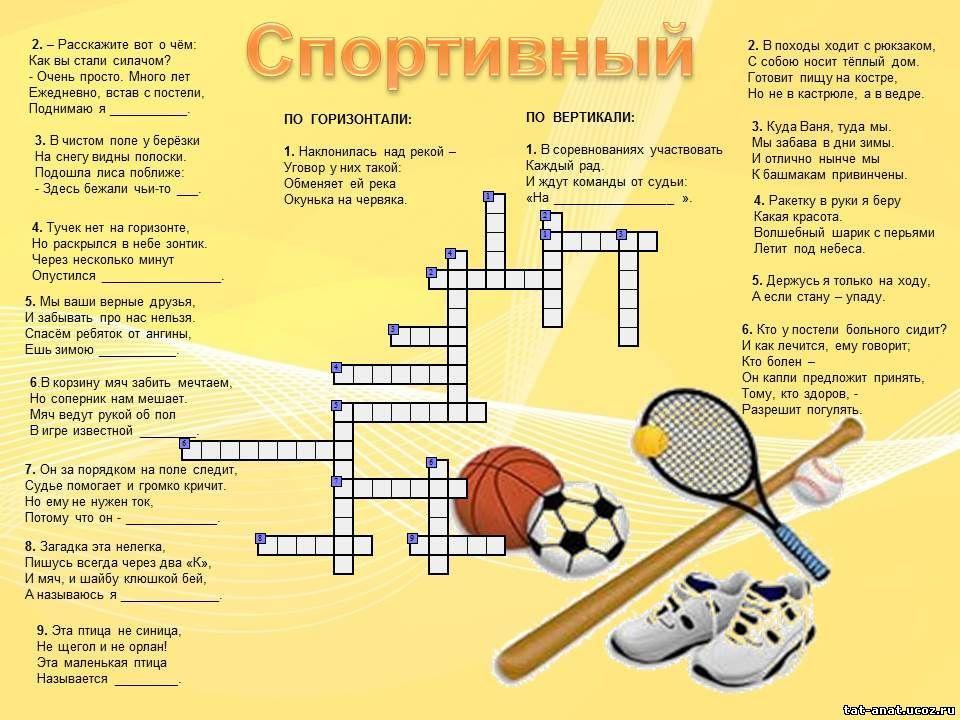 горизантали: 1.удочка, 2. гантель, 3.лыжи, 4. парашют, 5.витамины, 6.баскетбол, 7.свисток ,8.хоккей, 9.волан.. Вертикаль: 1.старт 2.турист 3.коньки 4.бадментон 5.велосипед 6.доктор