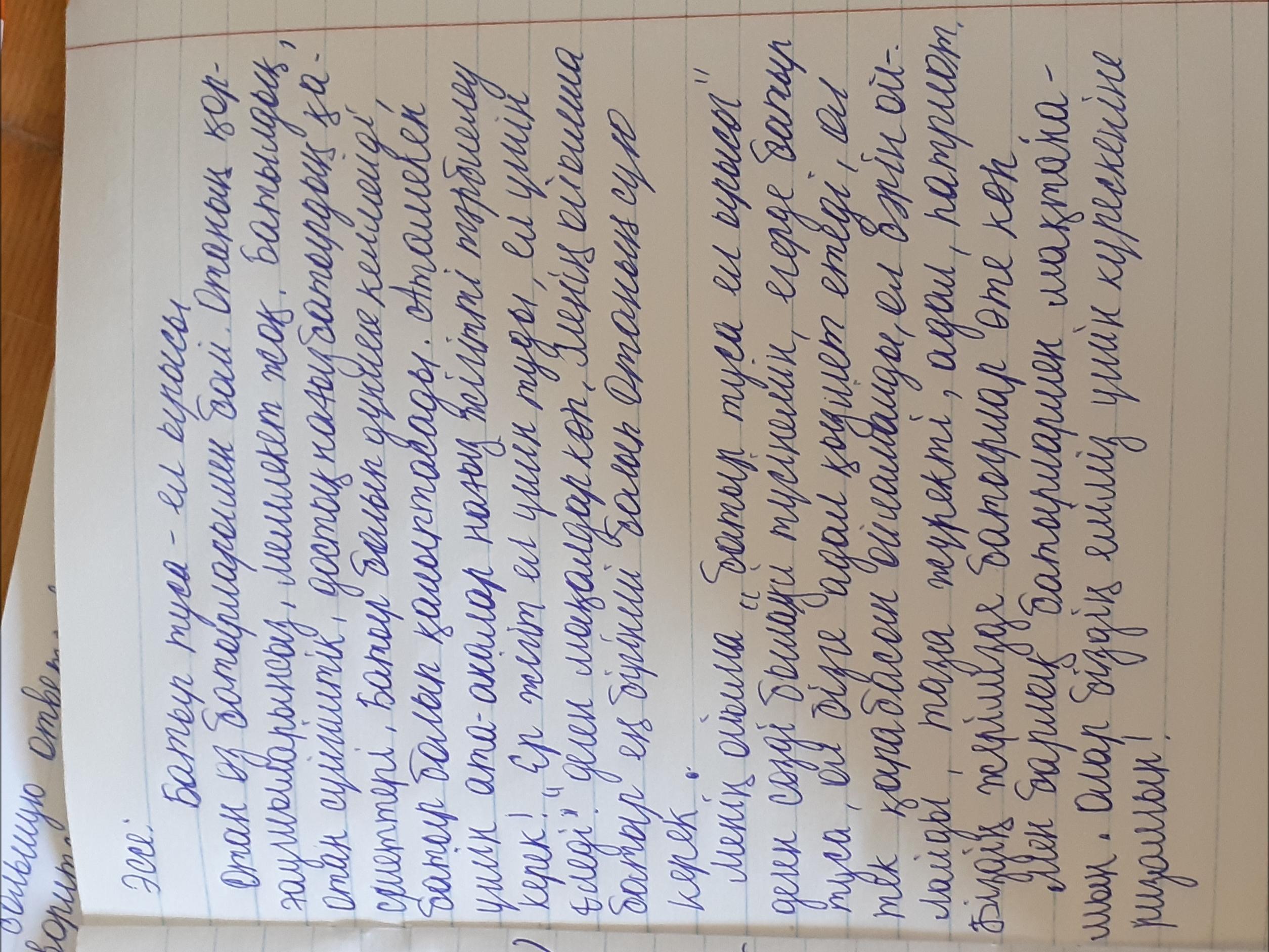 Отан өз батырларымен бай. Отанның қорғаушыларсыз, мемлекет жоқ. Бытылдық, Отан сүйгіштік, достық - нағыз батырдың сапалары. Батырлар болып дүниеге келмейді, олар болып қалыптасады. Балалық шақтан кішкентай балаға отаншылдыққа, құрметке тәрбиелеу керек. Атамекен үшін ата-аналарға нағыз жігітті тәрбиелеу керек ғой! Халықта дана мақал-мәтелдер бар: "Ер жігіт ел үшін туады, ел үшін өледі", "Ер барда - ел қор болмас" және тағы басқалар. Менің пікірінше, ең басты, ең негізгі батырдың сапасы - бұл отаншылдық. Отаншылдық - бұл туған жерге, өз халыққа, ұлтқа деген сүйіспеншілік.