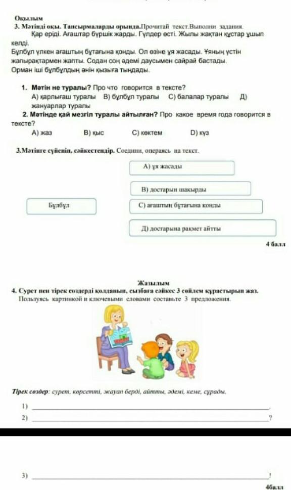 Ответ:1 -в, 2 - с , 3 - Бұлбұл ағаштың бұтағына қонды. 4 Суретші балаларға әдемі сурет көрсетті . Олар суреттегі не ?деп сұрады . Суретші оларға кеме деп жауап берді .
