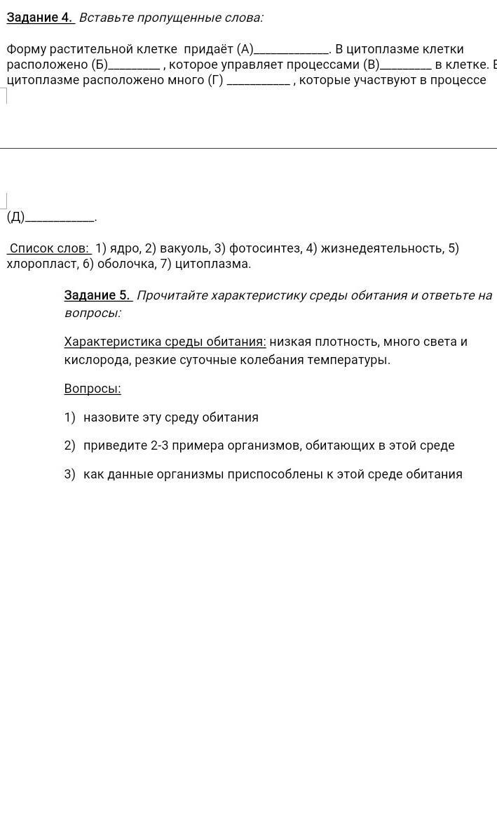 А - 6) оболочка, Б - 1) ядро, В - 4) жизнедеятельности, Г - 5) хлоропластов, Д - 3) фотосинтеза