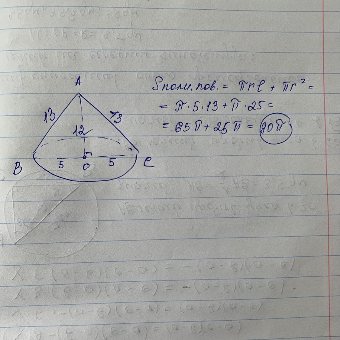 прямокутний трикутник з гіпотенузою 13 см і катети 12 см обертається навколо цього катета. знайдіть площу повної поверхні утвореного тіла обертання