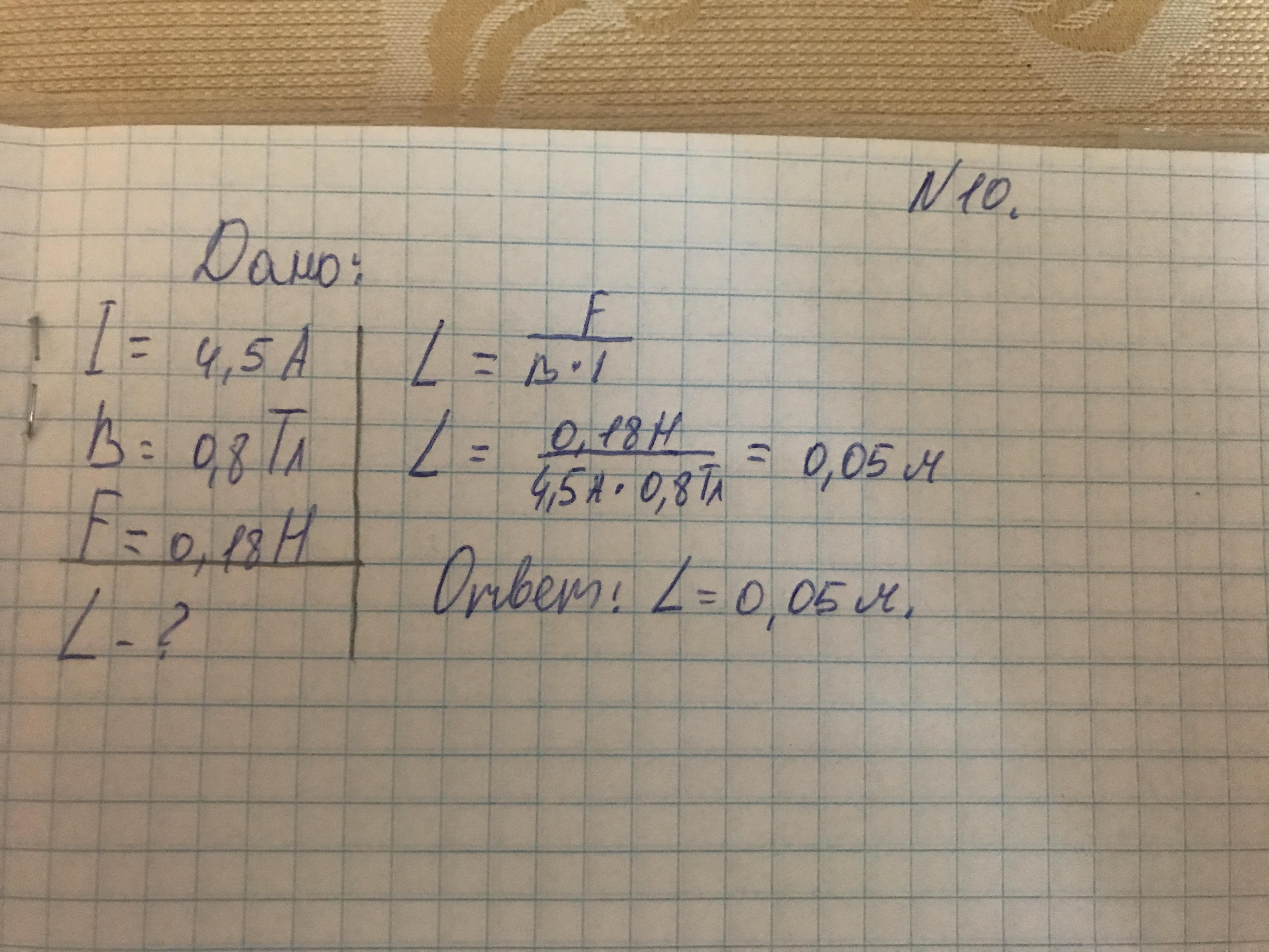 проводник с током сила которого равна 4,5 A находится в однородном магнитном поле с индукцией 0,8 Тл,линии которого перпендикулярны проводнику .зная ,что величина силы Ампера равна 0,18 H,найдите длину проводника