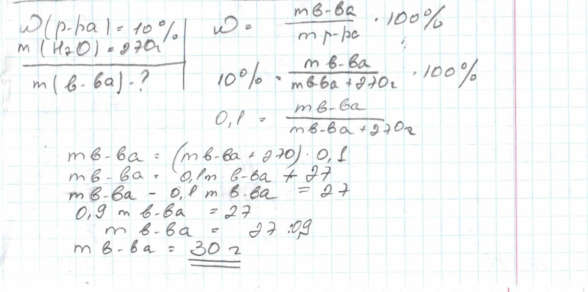 определите массу соли, которую нужно растворить в 270г воды, чтобы получить раствор с массовой долей вещества 10%.