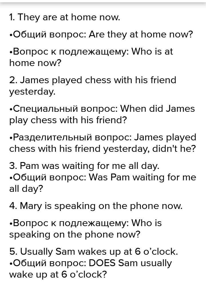 2. James played chess with his friend yesterday. (специальный вопрос, разделительный вопрос)