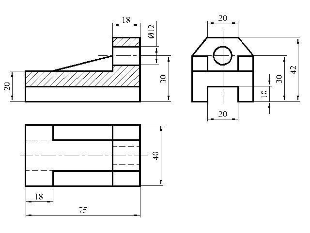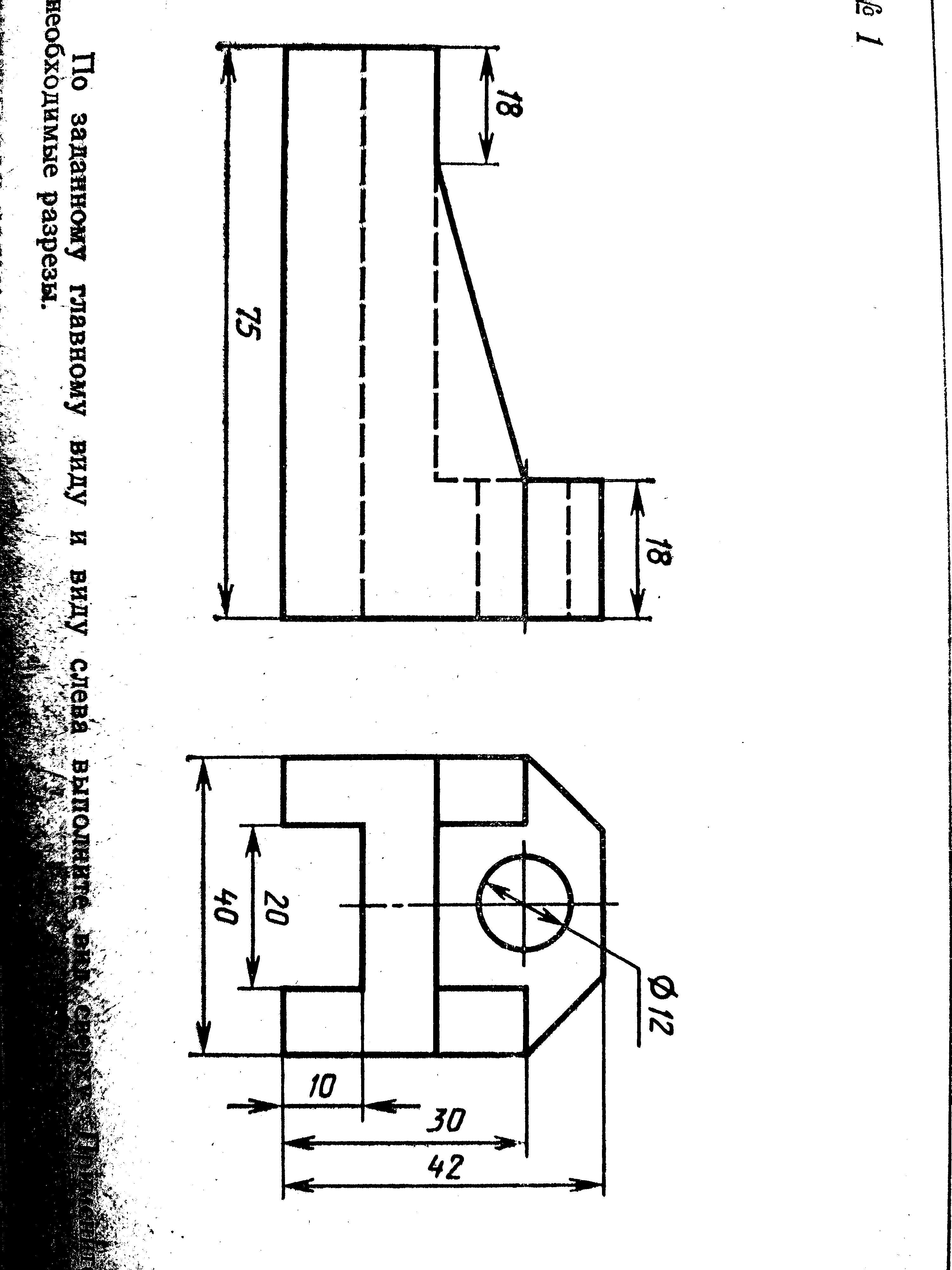 По двум заданным видам постройте третий вид. Примените необходимые разрезы. Нанесите размеры. Выполните технический рисунок детали.