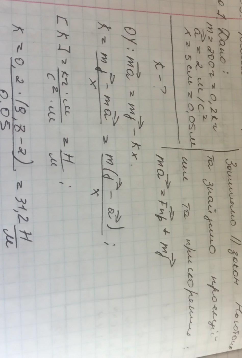 тіло масою 200 г,підвішене на пружині, опускають униз із прискоренням 2м/с2. Визначте жорсткість пружин,якщо її видовження становило 5см