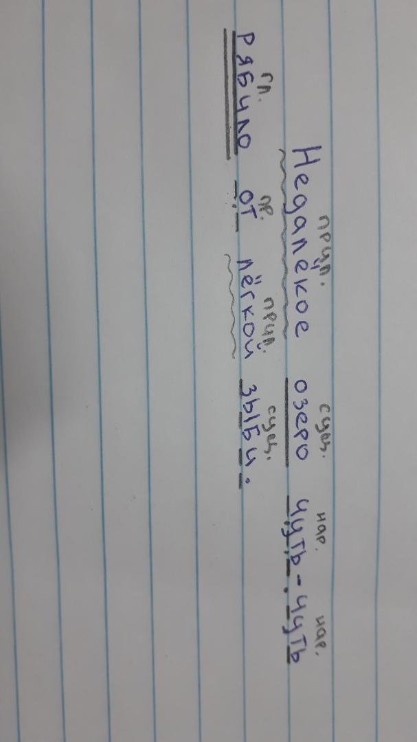 Недалёкое(прилагательное) озеро(существительное) чуть-чуть(наречие) рябило(глагол) от(предлог) лёгкой(прилагательное) зыби(существительное).
