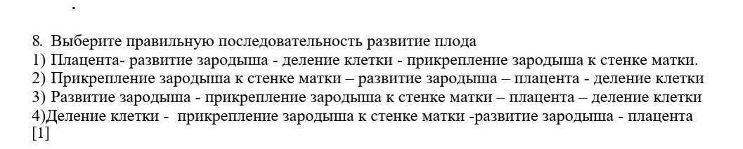 Ответ:ответ буде 4 потому что плацента развивается в последнее время, а деление клетки идет 1