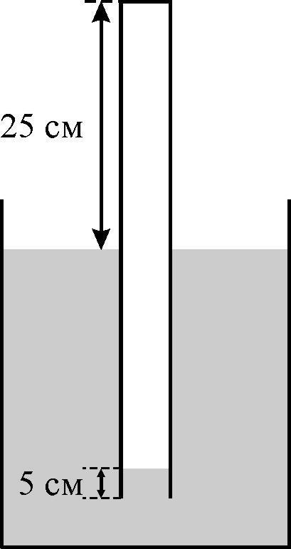 Пробирку высотой 50 см переворачивают вверх дном и погружают открытым концом в воду на половину высоты. При этом в пробирку затекает столбик воды высотой 5 см (см. рис). Атмосферное давление равно 100 кПа, плотность воды 1000 кг/м3, ускорение свободного падения 10 Н/кг. Найдите давление воздуха внутри пробирки. Ответ выразите в килопаскалях, округлите до целого числа. Ответ Найдите силу, с которой воздух давит изнутри на плоское дно пробирки, если её можно считать цилиндром с внутренним радиусом 1 см. Ответ выразите в ньютонах, округлите до целого числа. Ответ