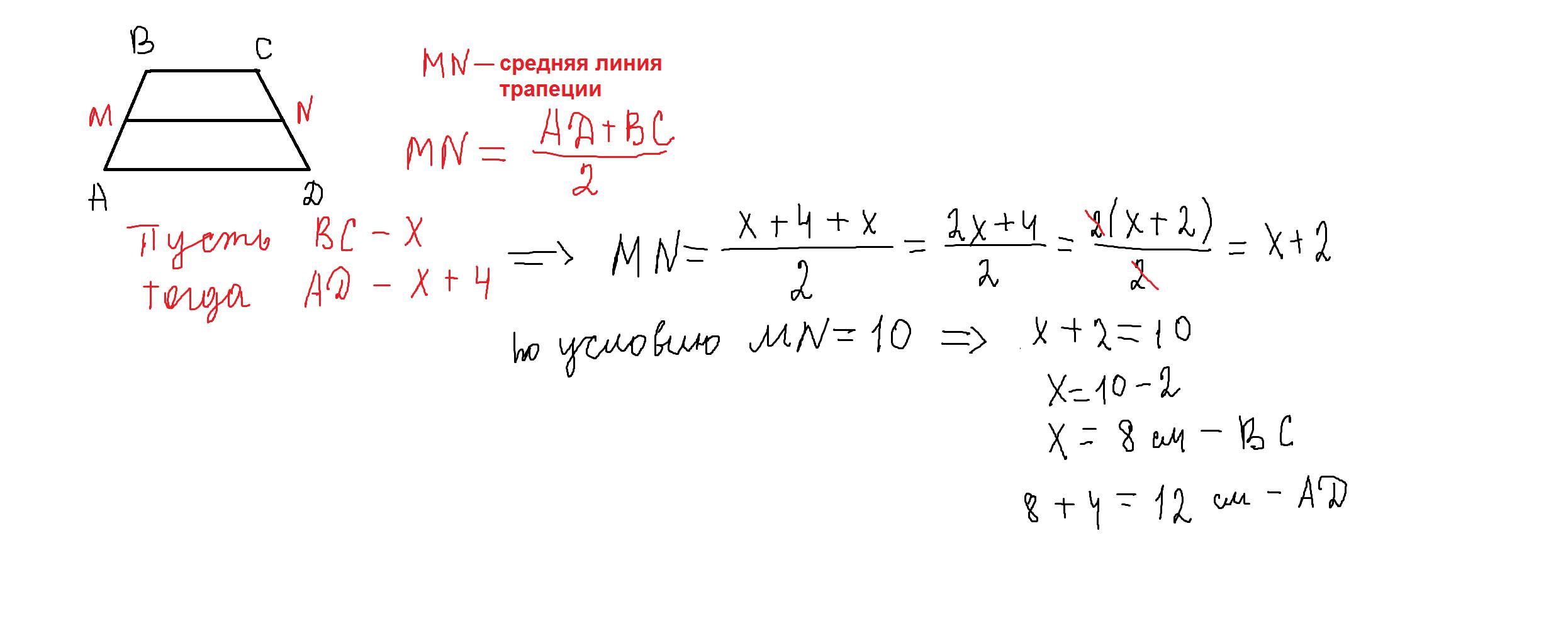 Середня лінія трапеції дорівнює 10 см. Знайдіть основи трапеції, якщо одна з них на 4 см більша за іншу.