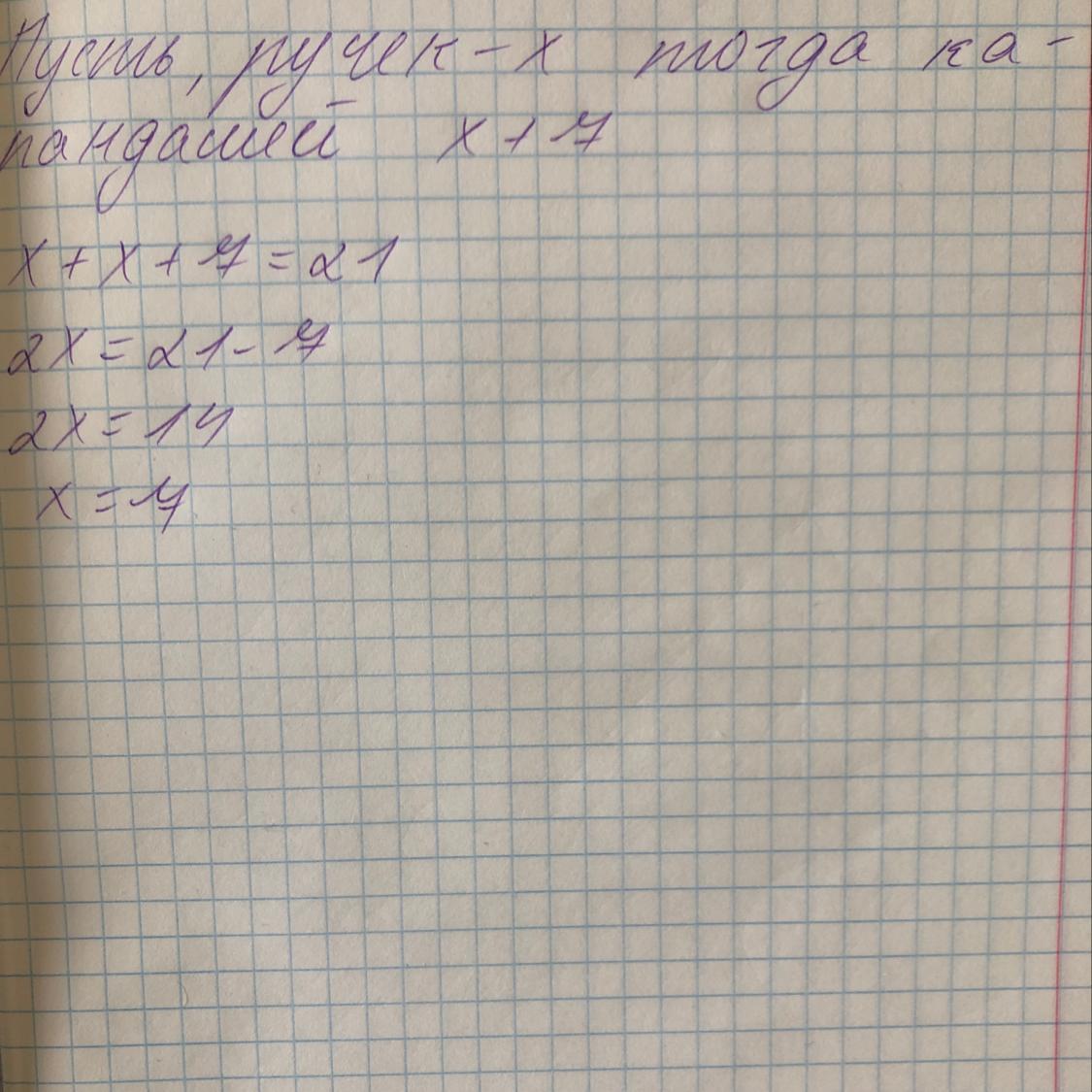 В карандашнице стояли карандашии ручки, всего 21. Карандашей было 7 больше, чем ручек. Ск карандашей ск ручек было в карандашнице? Составить систему решить её способом сложения