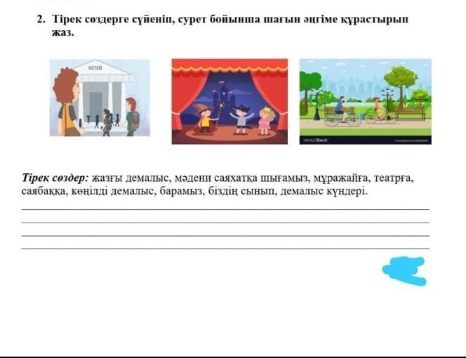 Тірек сөздерге сүйеніп , сурет бойынша шағын әңгіме құрастырып жаз . Тірек сөздер : жазғы демалыс , мәдени саяхатқа шығамыз , мұражайға , театрға , саябаққа , көңілді демалыс , барамыз , біздің сынып , демалыс күндері .