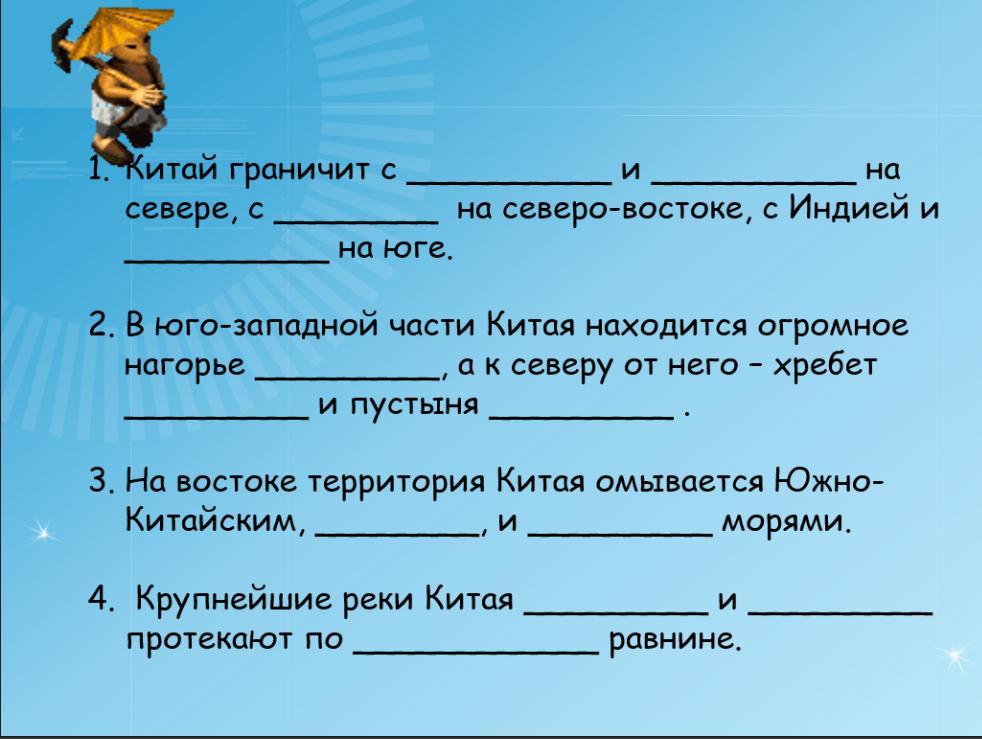 3-На востоке территория Китая омывается Южно-Китайским, Желтым, и Восточно-Китайскими морями
