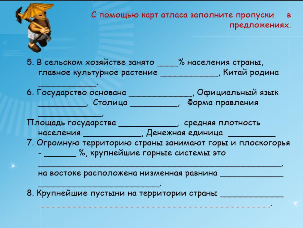 5-В сельском хозяйстве занято 80% населения страны, главное культурное растение лук, Китай родина ряда значительных изобретений человеческой цивилизации, в том числе четырёх великих изобретений древнего Китая: бумаги, компаса, пороха и книгопечатания
