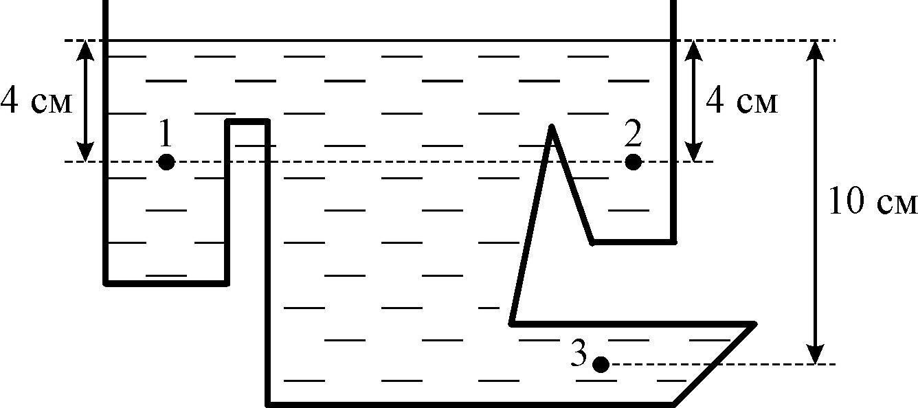 В изображённый на рисунке сосуд сложной формы налита вода плотностью 1000 кг/м3. Считайте, что g = 10 H/кг.